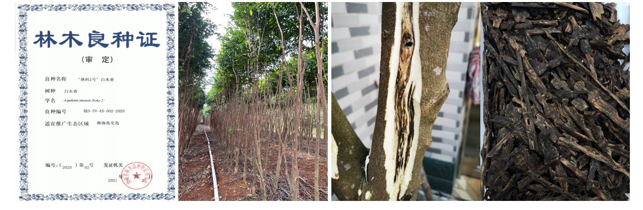 1.选育了沉香新品种,提供产业种源保障:选育了“结香快、产量高、品质优”的沉香树新品种5个;新品种树龄、结香时间缩短50%,产业提质增效显著;其中,“热科2、5、6号”白木香成为产区推广种植的主栽品种,在我国广东、广西、海南、云南、福建等省区种植达40万亩,占新增沉香种植面积的 90%,结香后潜在的经济价值可达千亿元以上。
