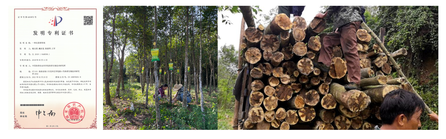 2.揭示了沉香结香机理,发明了高效结香技术:揭示了“逆境胁迫-微生物转化”的产香机制,研发了“高效、高产、低成本”的结香剂,构建了稳定高效的沉香整树结香技术体系。此项技术在“一带一路”沿线东南亚国家(如越南、老挝、缅甸等),以及海南、广东等省区示范推广结香50万株,显著提高了香农收入,获得了当地香农和政府的高度评价。