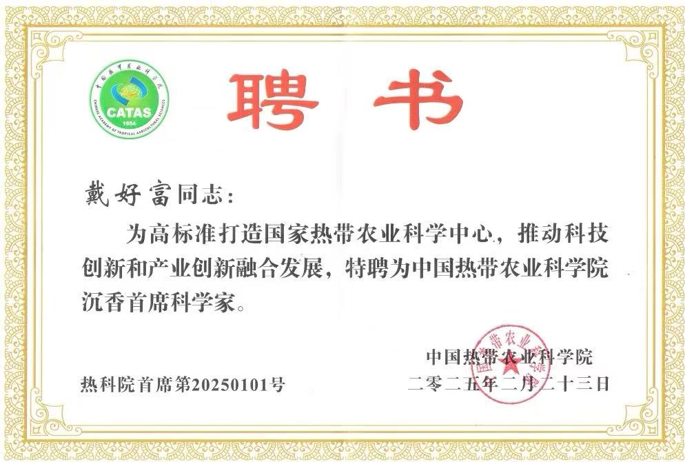 近日,中国热带农业科学院(简称“中国热科院”)正式发布聘书,聘任戴好富教授为中国热科院沉香首席科学家,聘书编号为“热科院首席第20250101号”。这一聘任是中国热科院为高标准打造国家热带农业科学中心、推动沉香领域科技创新与产业创新融合发展的重要举措。
